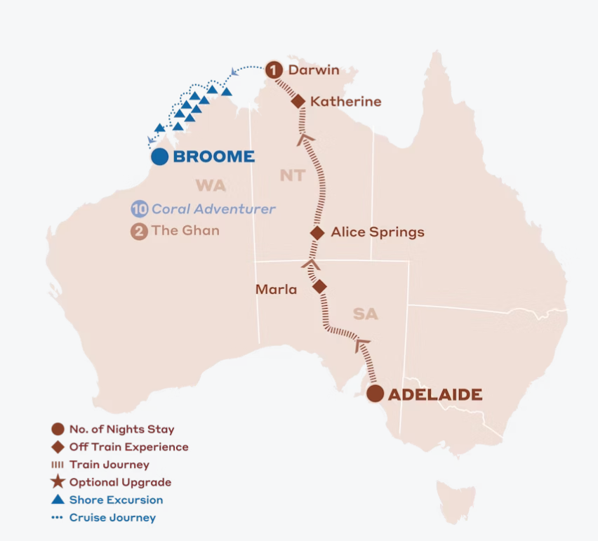 2 晚 Ghan 號航班,阿德萊德至達爾文,包括所有餐點、飲料以及馬拉、愛麗絲泉和凱瑟琳的火車外體驗
